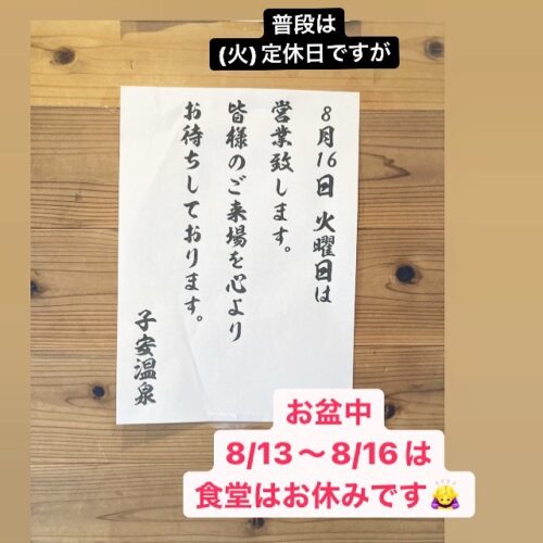 8月16日火曜日はお盆期間中の為、営業致します。(食堂はお盆期間中お休みさせて頂きます)